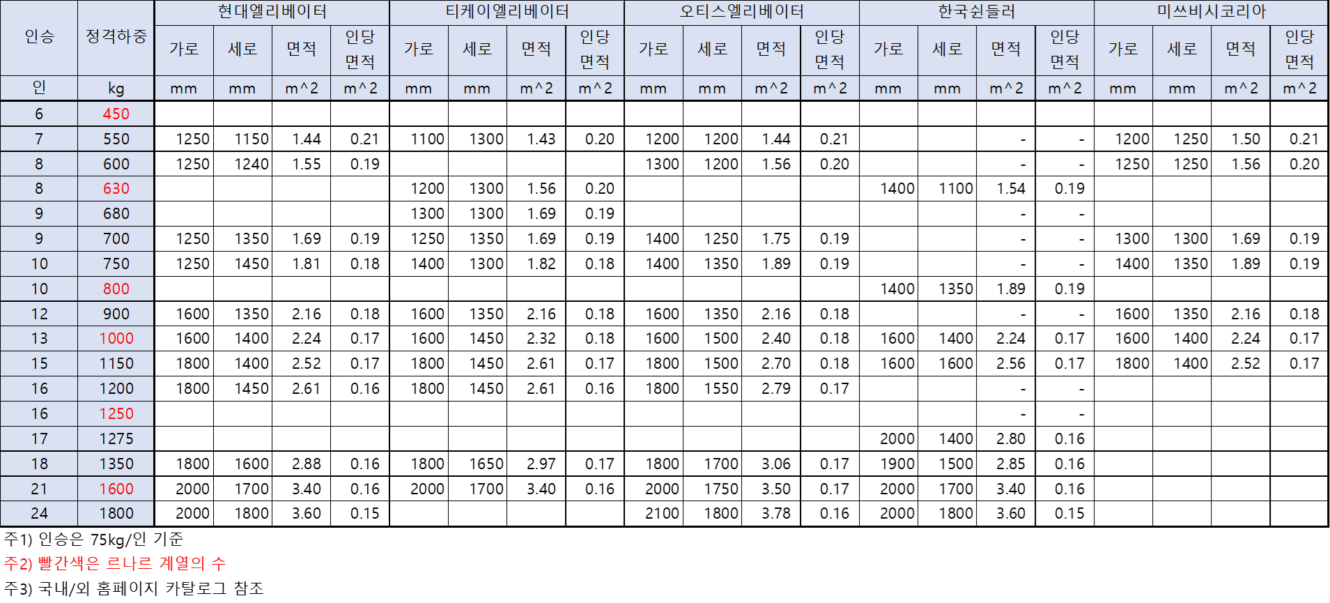 | 비고 1. 정격하중 100가) ㎏은 1인승 엘리베이터의 최소 무게 2. 정격하중 180나) ㎏은 2인승 엘리베이터의 최소 무게 3. 정격하중이 2,500다) ㎏을 초과한 경우, 100 ㎏ 추가 마다 0.16 ㎡의 면적을 더한다. 4. 수치 사이의 중간 하중에 대한 면적은 보간법으로 계산한다. |
