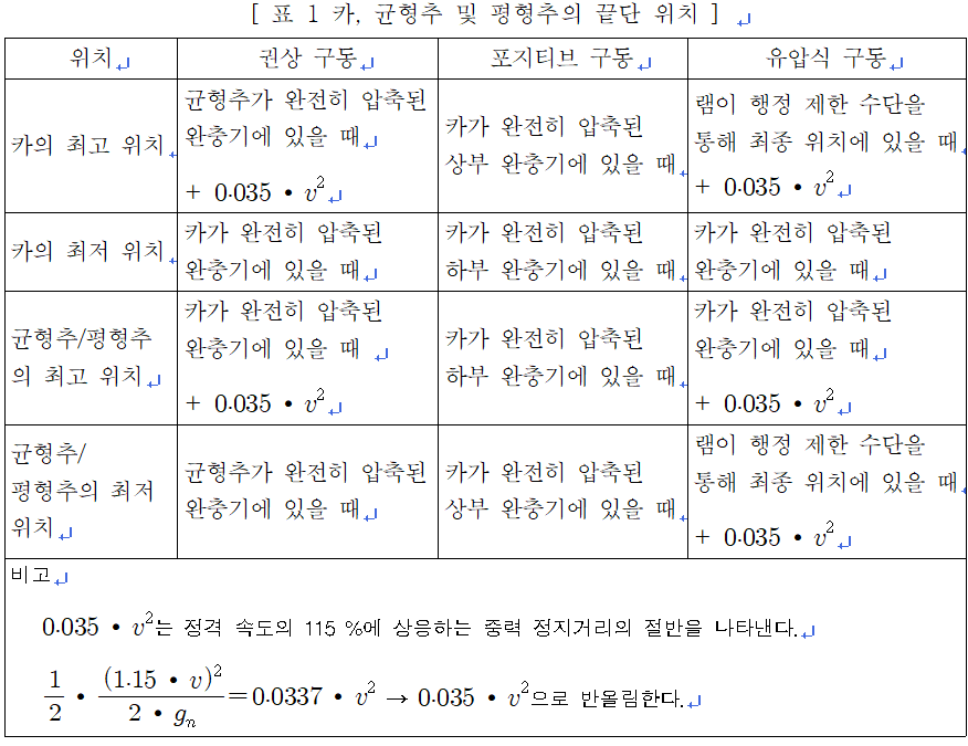6.5.6.1.1 표 1에 따른 카, 균형추 및 평형추의 끝단 위치는 6.5.6에 따른 주행구간, 6.5.7 및 6.5.8에 따른 피난 공간 및 틈새에 관한 기준이 고려되어야 한다.
