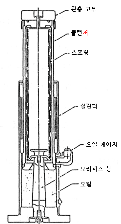 | 배출구(노즐) 방식 | 플런저가 눌러질수록 오일이 빠져나가는 구멍(노즐)의 수가 줄어(점진적으로 감소) 완충력이 증가한다. | ![]() |