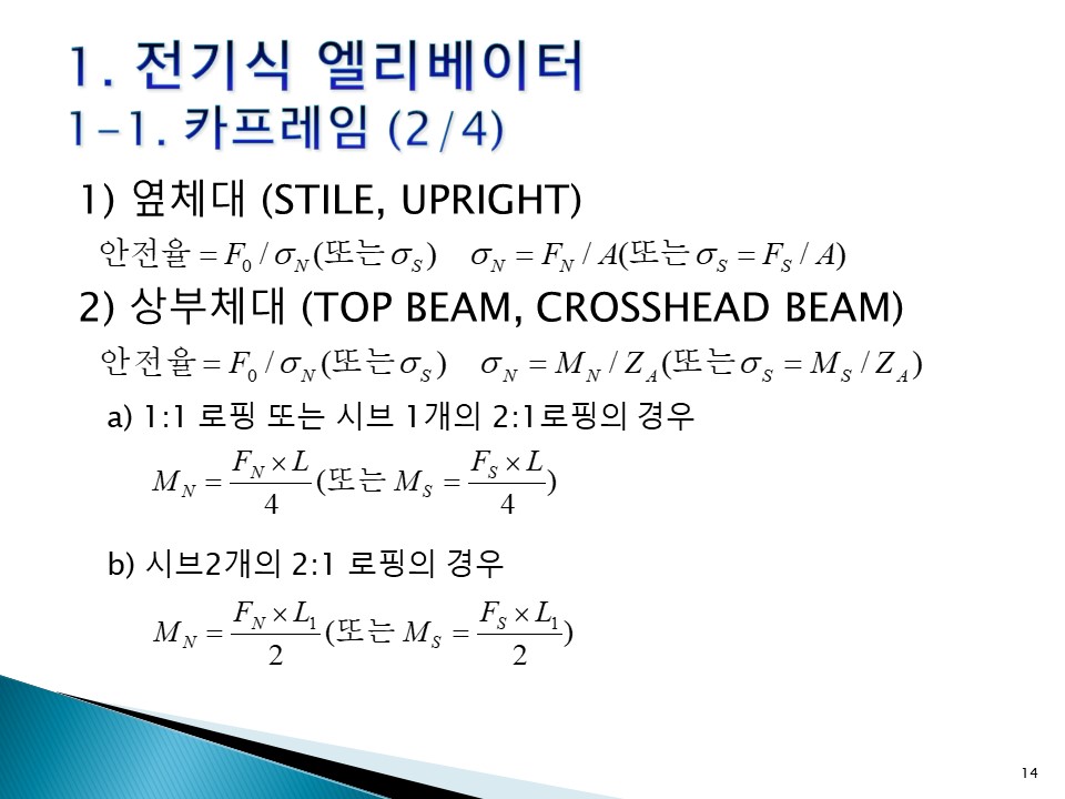 우리나라의 안전기준은 EN81-20/50을 기반으로 하고 있어 구조부품의 상세한 계산방법이 기술되어 있지는 않지만 미국 ASME A17.1이나 일본 건축기준법 및 관련 법령에서는 주요 부품의 강도계산방법에 대해서 상세히 기술되어 있다.